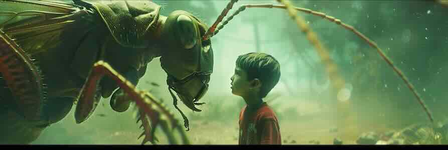 Mandel played the polite diplomat and replied, "Hi Johnny Smith. I'm Mandel." He reached his hand toward the giant bug who, unfamiliar with his customs, gently touched Mandel's arm with the rigid shell of his own.